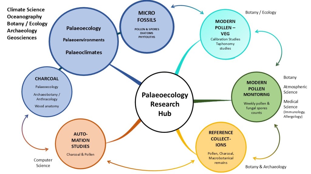 Transdisciplinary connections with the fields of: Botany (palaeoecology – ecology links, wood anatomy, marine botany – diatoms). Geology (sedimentology, geochemistry), Zoology (herbivore – fungal spore relationships), Ocean & Coastal Science (coastal wetlands), Medicine (allergies – pollen) and Computer Science (automation, machine learning)
